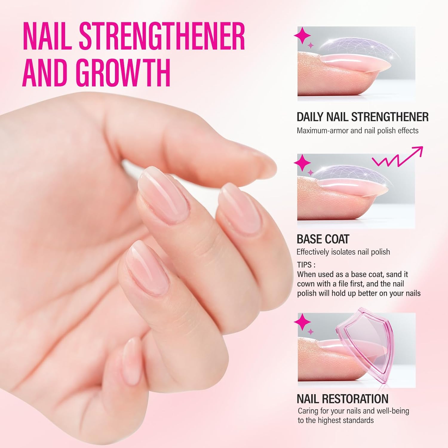 - Transform Your Manicure with Our 8-in-1 Nail Strengthener: Experience the ultimate nail care with our updated formula that combines Nail Protein Strengthening, Base Coat, Nail Ridge Filler, Nail Repair, Quick-Drying, and Nail Polish in one bottle. Perfect for most nail types, this versatile solution simplifies your nail routine and enhances any nail art design effortlessly with a soft, warm pink with a hint of peach.