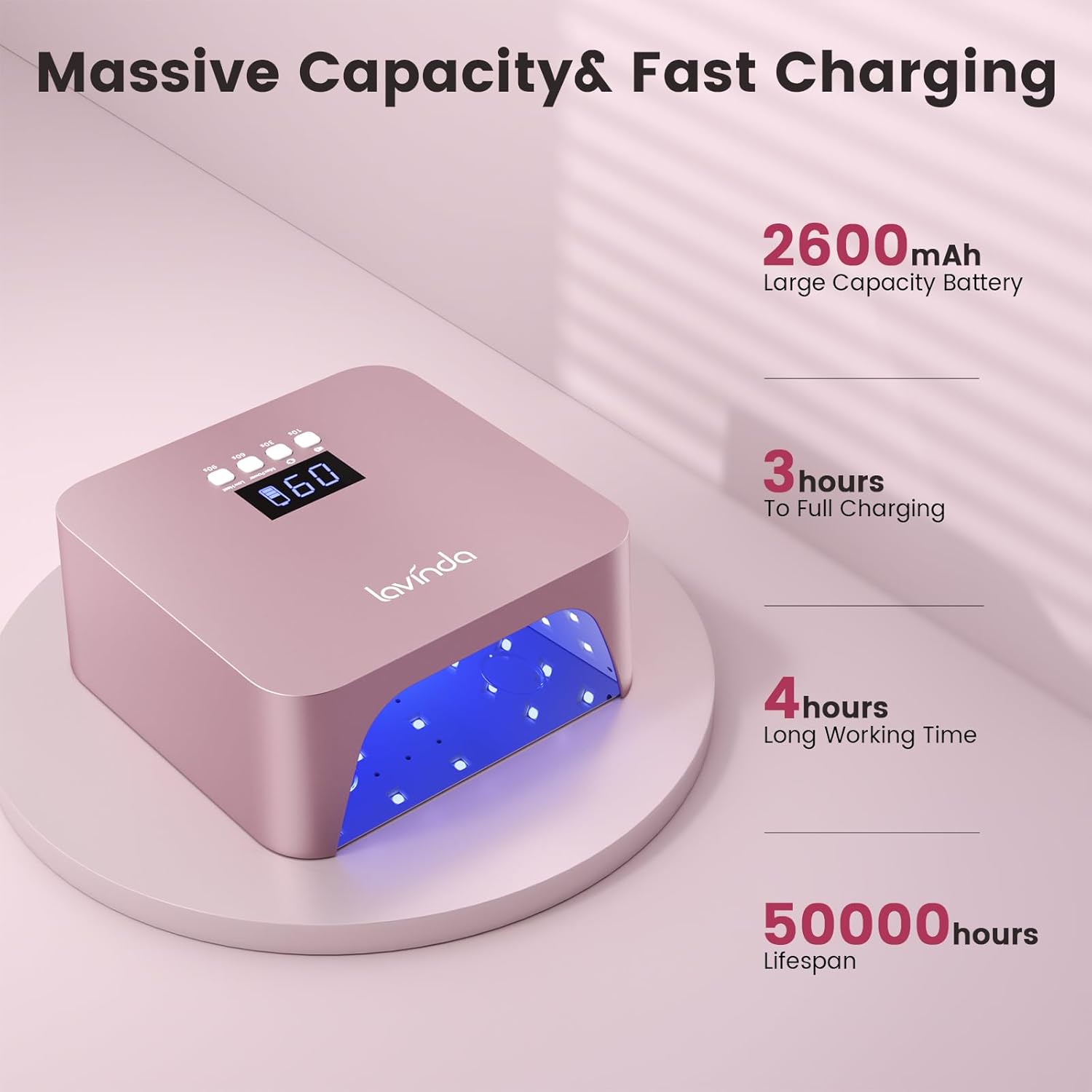 - 【Rotating Display & 2600mAh Battery】 This gel nail lamp features a digital LCD screen with 4 timer modes: 10s/30s/60s/90s. Long-press (1.5s) to seamlessly switch between low heat, mute, and screen rotation—all clearly shown on the display. Powered by a 2600mAh rechargeable battery, it delivers 3–4 hours of cordless runtime and fully charges in just 3 hours. Designed for efficiency in both salon and home use.