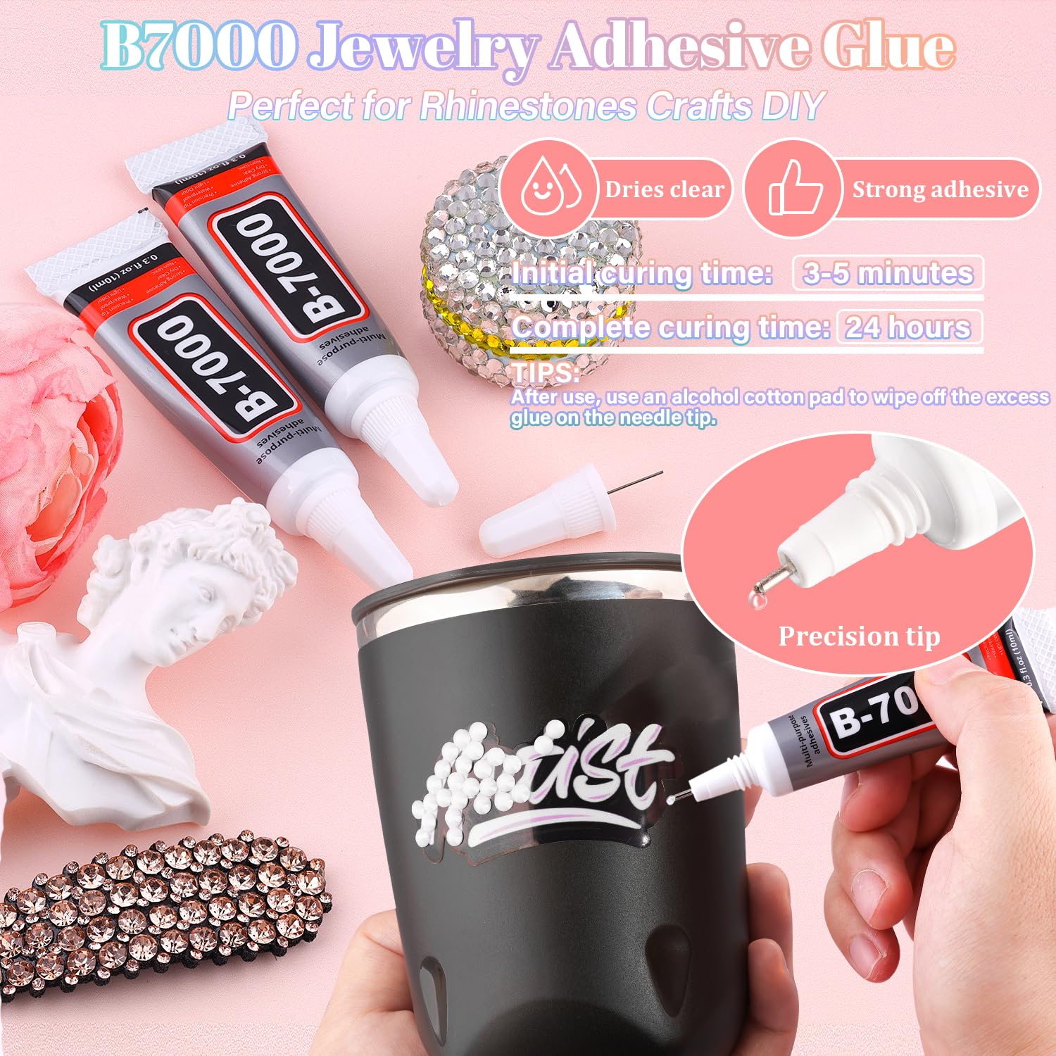 - STRONG B7000 GLUE FOR GEMS – B7000 glue offers strong, long-lasting adhesion and dries clear, making it perfect for securing gemstones and other embellishments. The precision needle tip allows for controlled, mess-free application. For best results, clean the needle with an alcohol wipe after each use to prevent clogging and ensure smooth flow every time.