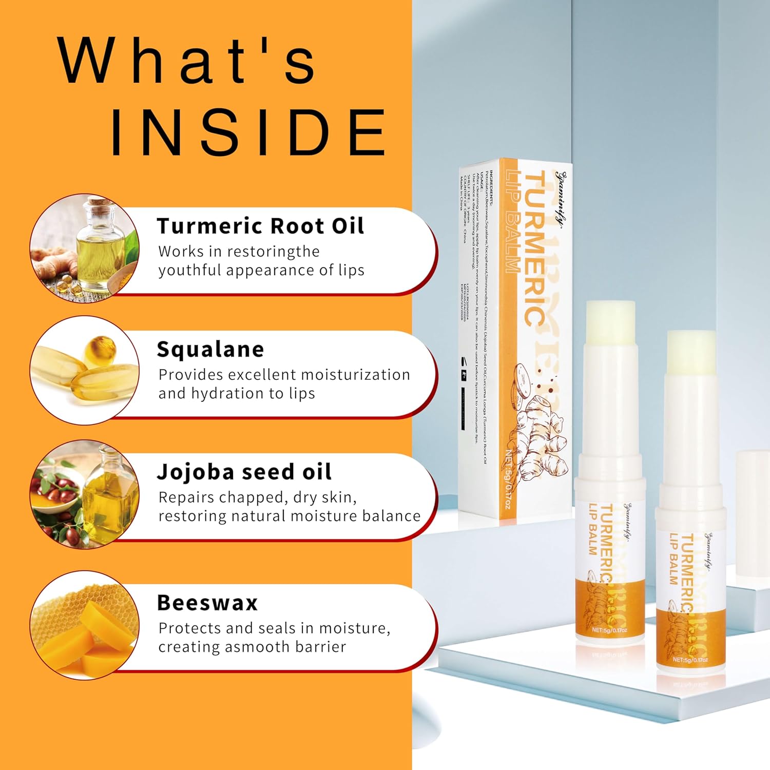- PORTABLE PACKAGE:Packed in a compact tube, turmeric lip balm is easy to carry wherever you go. Whether in your wallet, pocket, or travel bag,The convenient size makes it perfect for daily use and it can be used for lip care anytime and anywhere