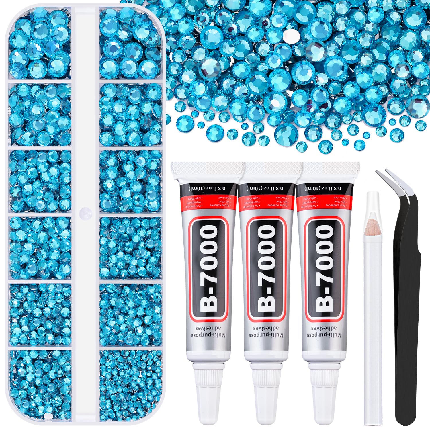- WHAT YOU WILL GET -- The package includes 1 box of flatback rhinestones with 12 grids in diffrent sizes(2/3/4/5/6mm). 1 tweezers for large size gems, 1 pickup pen for small size gems. 3 B7000 adhesive jewels glue for jewelry making