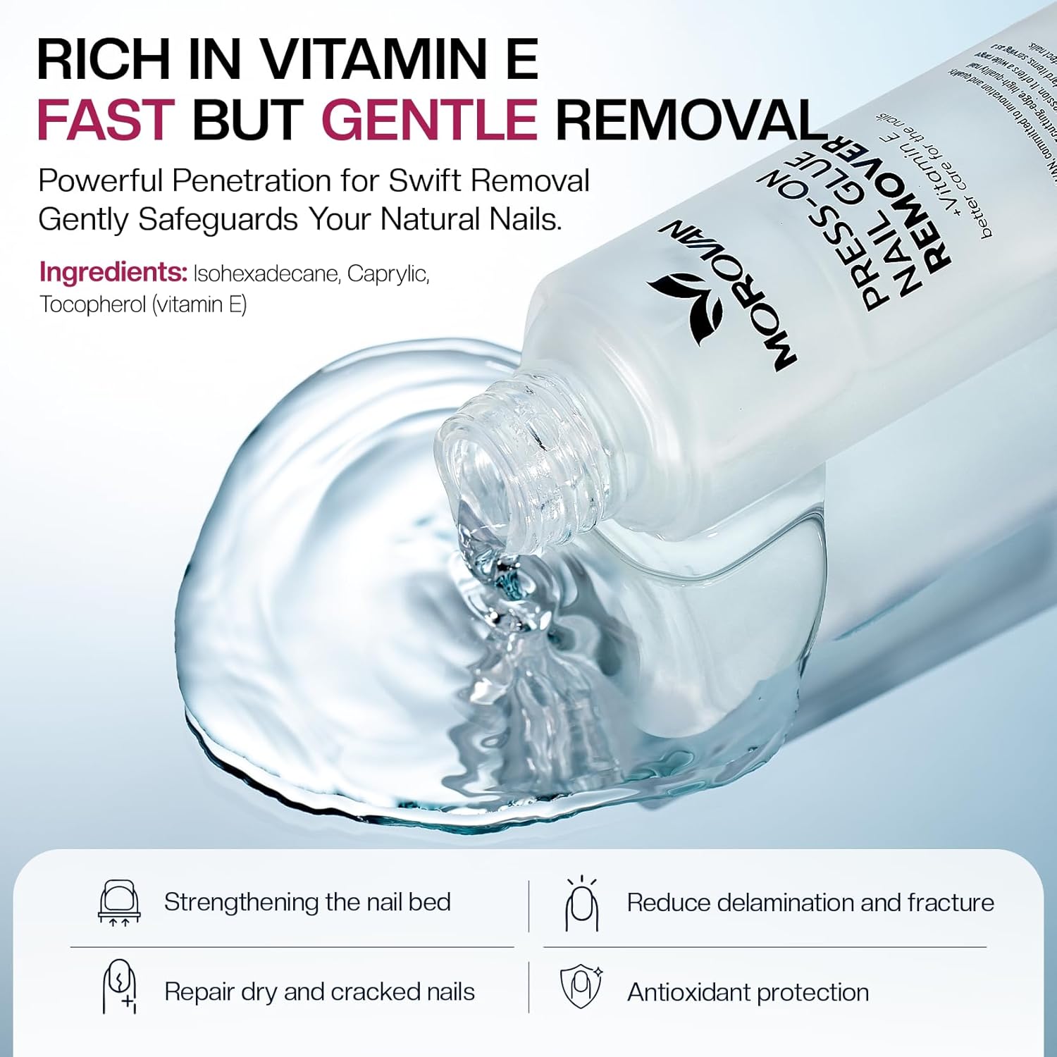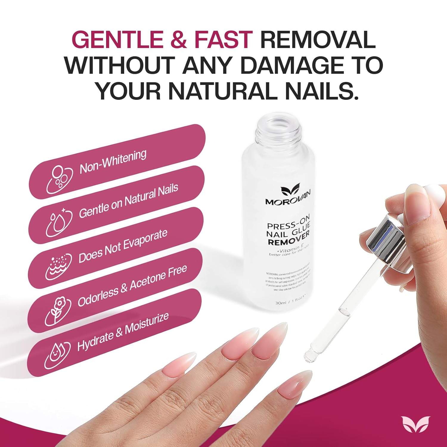 - Fast & Gentle & Healthy Nail Glue Remover: Morovan nail glue remover includes 30ml press-on nail remover and nail remover tool, acetone-free, odorless, fast and gentle to dissolve nail glue, while avoiding the erosion of natural nails by traditional acetone-based nail glue removers. With added cuticle oil + vitamin E ingredients.
