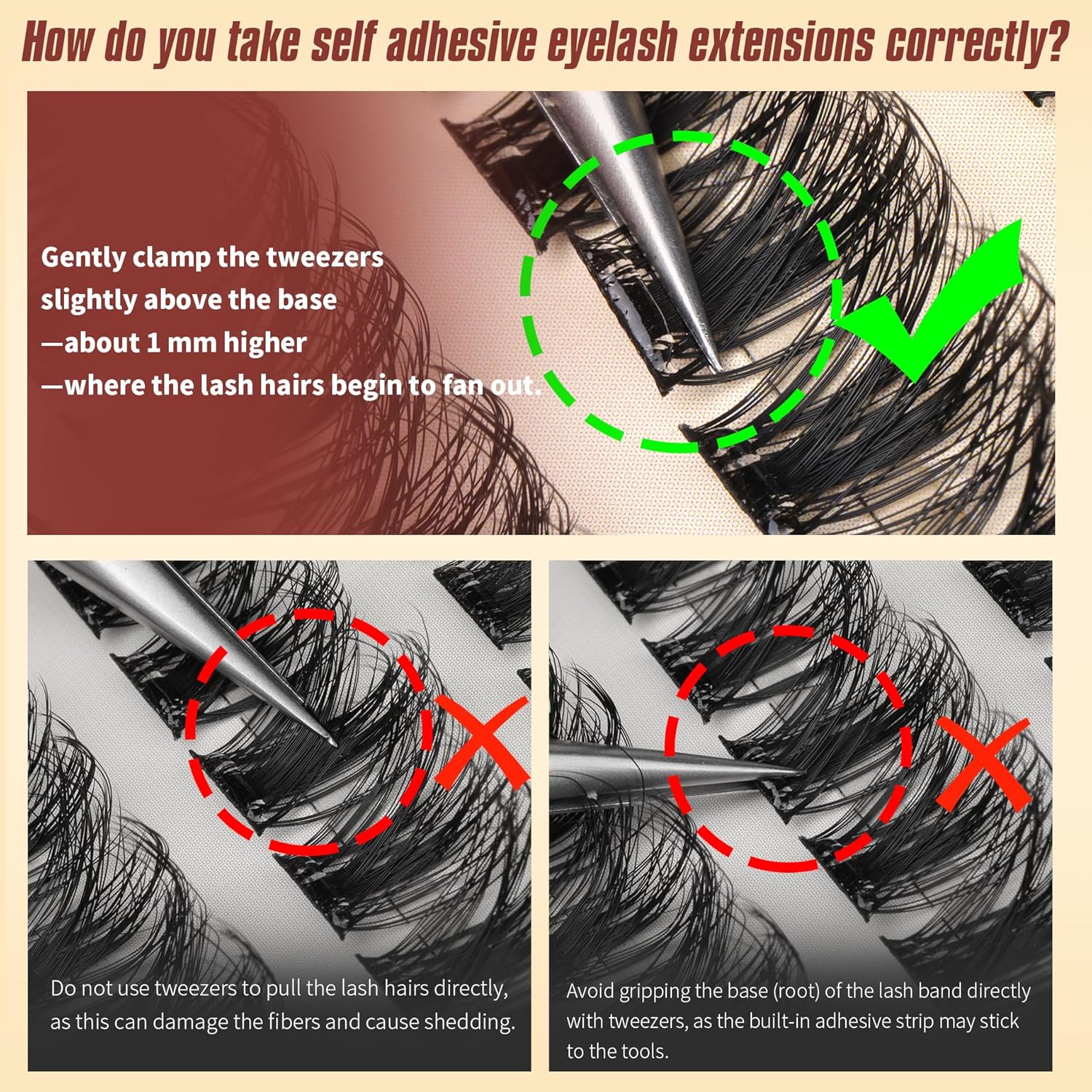 - Pro Tips for Perfect Stick On Eyelash Extensions: For flawless no glue lashes, first curl your natural lashes, then use tweezers to grip these self-adhesive eyelash clusters precisely 1mm above the adhesive band (never touch the sticky part!), starting from the outer corner and pressing close to your lash line - these stick on eyelash extensions blend seamlessly when applied correctly while the natural self adhesive lash extensions ensure easy removal without residue for perfect all-day wear.