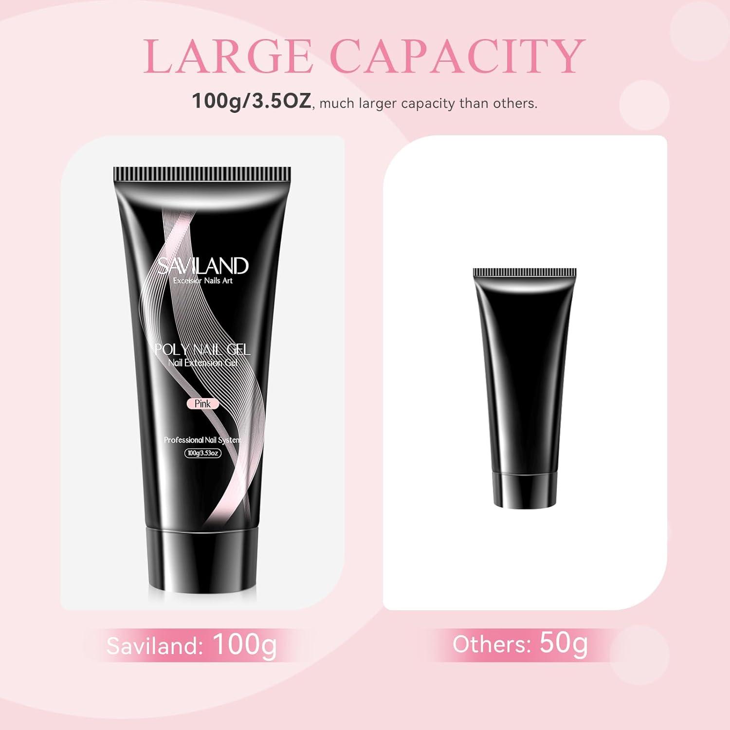 - š· SAVILAND BIG POLY NAIL GEL-Saviland 100g/3.5oz pink poly extension gel with popular classic color, can do nail extension, poly gel nails, nail enhancement, nail art, stick sequins or decorations, etc. 100g super large capacity, valuable, and long service life. It is very suitable for professional nail salons and nail lovers who often make extension. Can mix with other colorful gel to create various and attractive nail art.