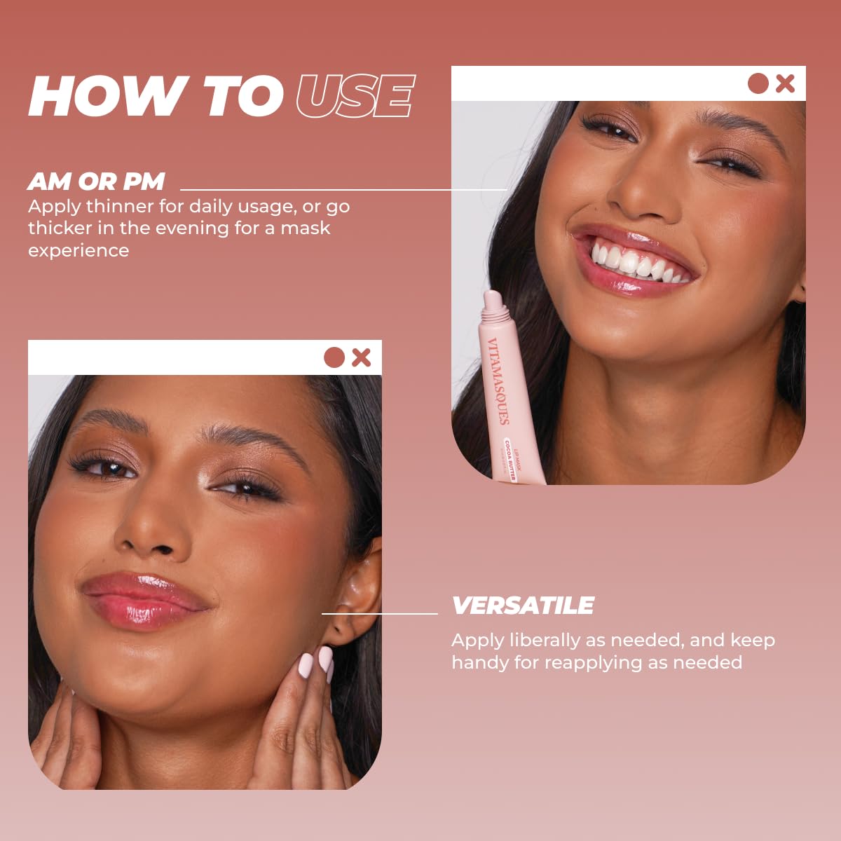 - INSTANT HYDRATION: Vitamasques lip balm starts working immediately, providing your lips with much needed hydration as soon as you apply. Ensuring soft and plump lips with every use. Eradicating the need for chapstick or lip oil